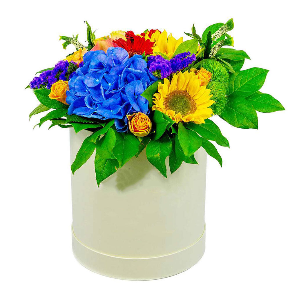 Гортензия, роза, подсолнух, гербера, статица, зелень.